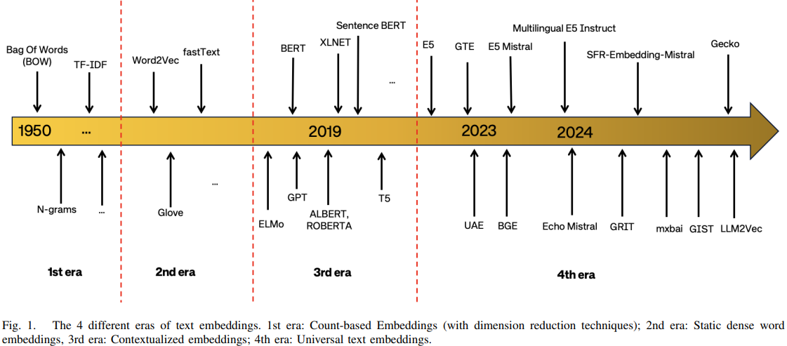 The evolution of text embeddings is a timeline of increasing complexity and understanding. We moved from simple counting (how many times does this word appear?) to static vectors, and finally to the dynamic, context-aware models we use today.